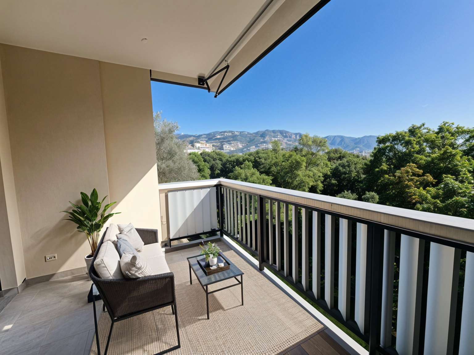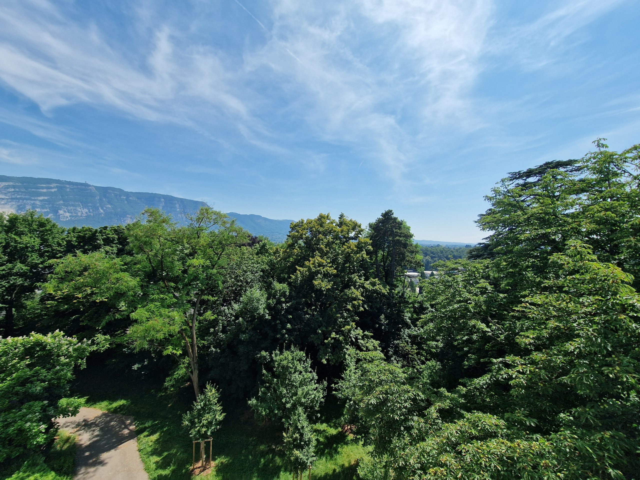 Opposite is a beautiful fully equipped kitchen and your magnificent modular living room with the second bedroom, all opening onto a large balcony with a beautiful panoramic view of Salève.